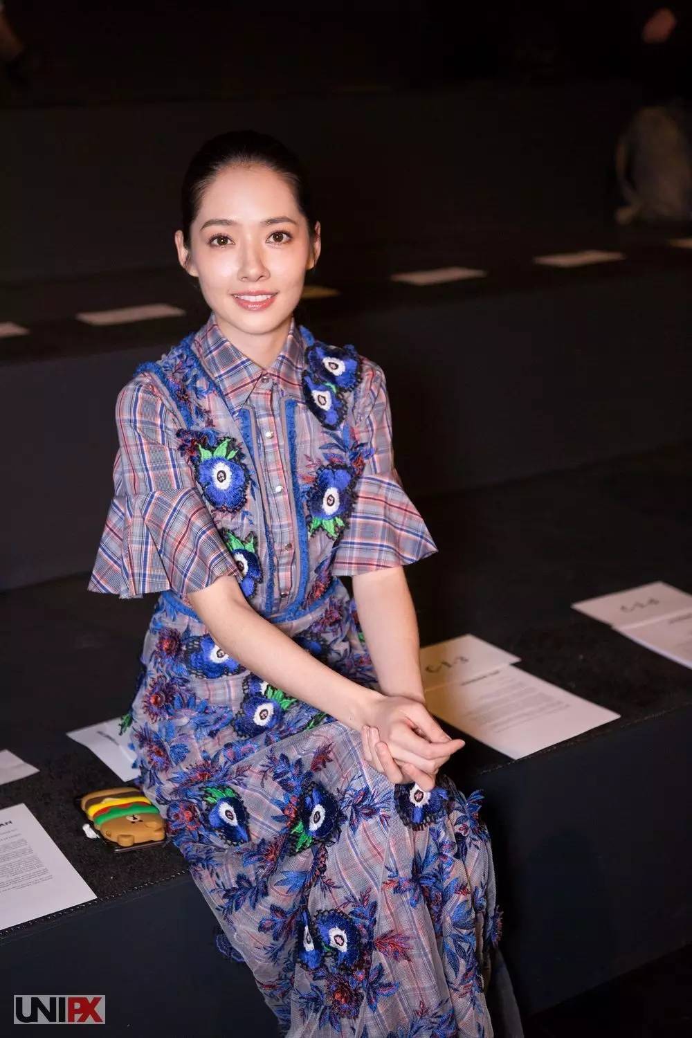 “玉女掌门”郭碧婷一袭精致的格纹刺绣花朵长裙,尽显田园清新气质。
