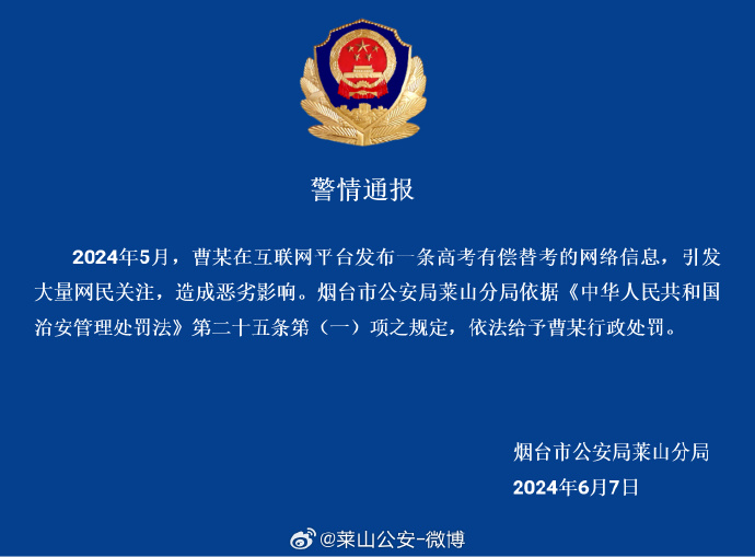 6月7日,烟台市公安局莱山分局发布2则警情通报:2024年5月,王某某在互联网平台以发布一条高考代考帖子的形式虚构事实扰乱公共秩序,造成不良社会影响。烟台市公安局莱山分局依据《中华人民共和国治安管理处罚法》第二十五条第(一)项之规定,依法给予王某某行政处罚。2024年5月,曹某在互联网平台发布一条高考有偿替考的网络信息,引发大量网民关注,造成恶劣影响。烟台市公安局莱山分局依据《中华人民共和国治安管理处罚法》第二十五条第(一)项之规定,依法给予曹某行政处罚。