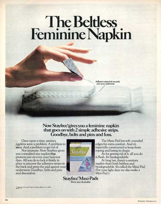 在卫生巾产品创新上,又一个历史性的突破来自70年代的娇爽(Stayfree),它推出了第一款有粘帖功能的卫生巾,也就是最接近我们今天用的那种。在那之前,卫生巾都长的像一个特殊的绷带。