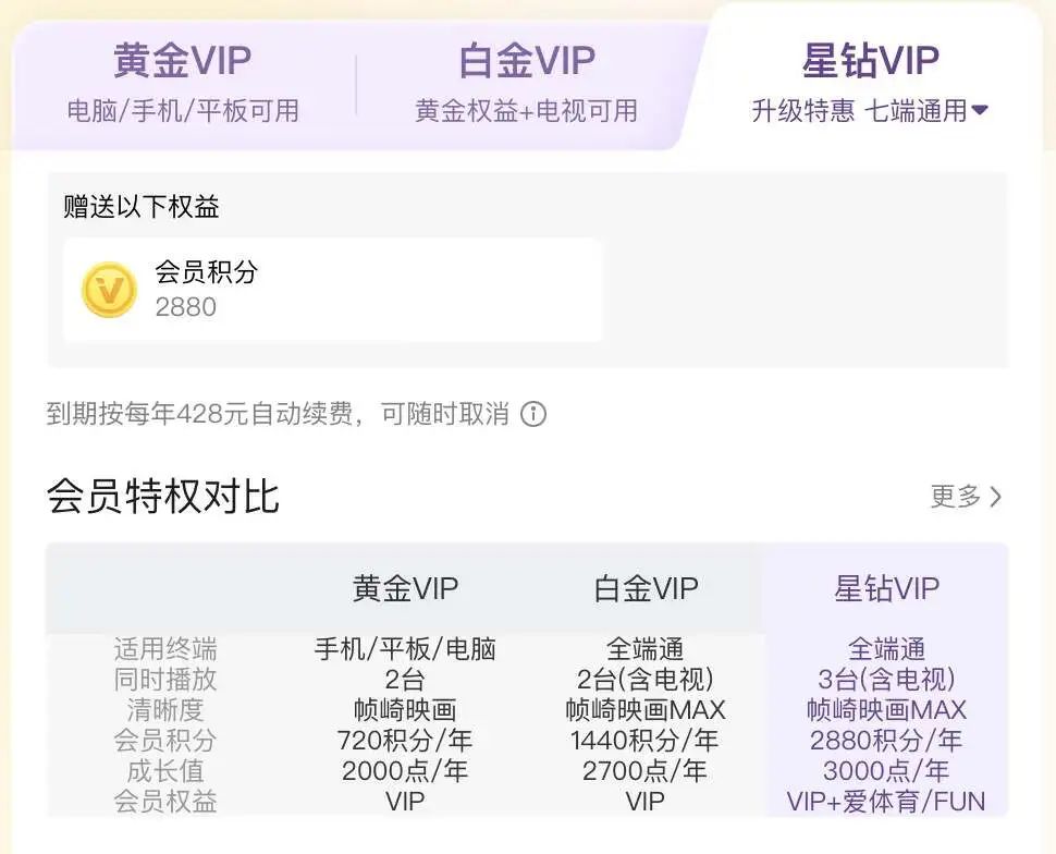 图:爱奇艺不同等级会员特权对比,来源:爱奇艺官方网站 《听筒Tech》截图