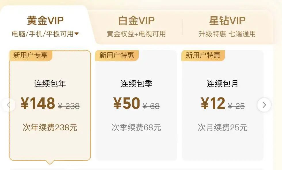 据媒体报道,自2020年底到2022年底,爱奇艺提价了三次,目前黄金VIP会员的月卡从19.8元涨到了30元,连续包年则从178元涨到238元,涨幅分别为51%和34%。