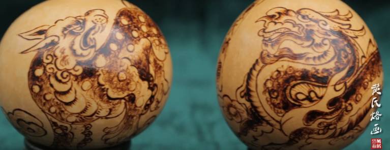 至于黄师傅为什么特别偏爱葫芦,正是因为看中了葫芦本身的材质,以及谐音“福禄”的美好寓意。葫芦必须用自己种的,这样才能保证每一个葫芦的品相都是佳品。新葫芦通常需要晾晒2-3个月,才能开始作画。