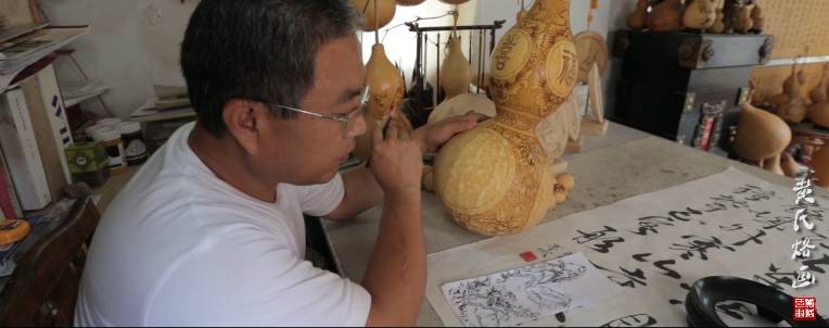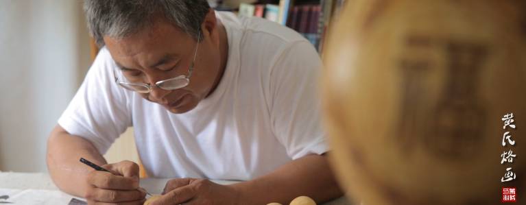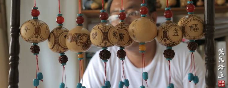 走进黄旭的烙画工作室,一进门就看到大小各异、满身图纹的葫芦挂满了整个房间。定睛一看,有的画着含苞待放的牡丹,有的画着手握兵器的神仙,有的画着寓意吉祥的福字......而黄师傅,正低着头精心打磨着自己心爱的小葫芦。