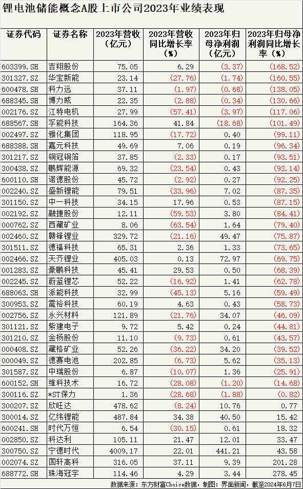 界面新闻根据东方财富Choice数据粗略统计的37家A股锂电池储能相关上市公司中,仅宁德时代(300750.SZ)、国轩高科(002074.SZ)、珠海冠宇(688772.SH)、亿纬锂能(300014.SZ)等7家公司于2023年实现归母净利润较上年有所增长,其余30家盈利额均有所下滑,占比超81%。