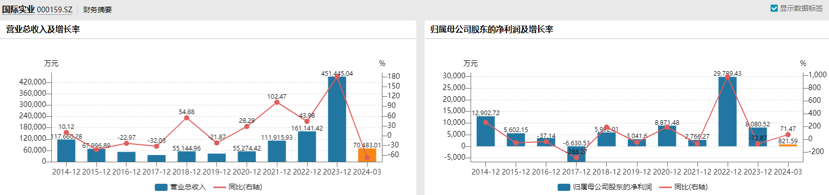 今年,国际实业业绩有所好转。2024年一季度,该公司实现归母净利润同比增长71.47%至821.59万元。