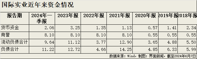 国际实业2024年一季度报告显示,截至2024年3月31日,该公司商誉为8.1亿元。国际实业前述证券部工作人士对界面新闻坦言,这些商誉主要来自收购中大杆塔。此外,该公司截至2024年3月31日货币资金约2.06亿元、总负债11.22亿元、流动负债9.64亿元。
