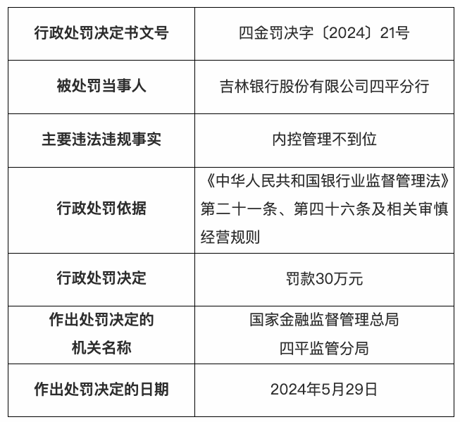 6月7日,国家金融监督管理总局四平监管分局行政处罚信息公开表显示,2024年5月29日,吉林银行股份有限公司四平分行因内控管理不到位,被处罚款30万元。时任吉林银行股份有限公司四平分行行长刘亚文对上述违法事项负有责任,受到警告处罚。