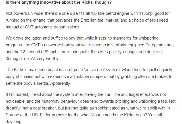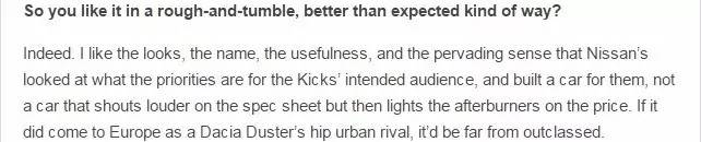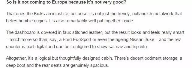 由于kicks只在部分地区销售,因此目前只有小数媒体有机会试驾,例如TopGear。下面,就看看这些国外媒体都如何评价Kicks(英语渣,若翻译有误,请多多包涵)。