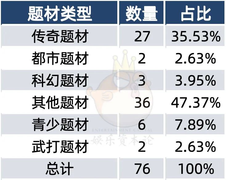 在题材方面,其他题材占比最高,共36部387集,占总备案数量的47.37%,其次是传奇题材27部279集,占总备案数量的35.53%,青少题材6部137集,科幻题材3部49集,都市题材2部38集,武打题材2部46集。