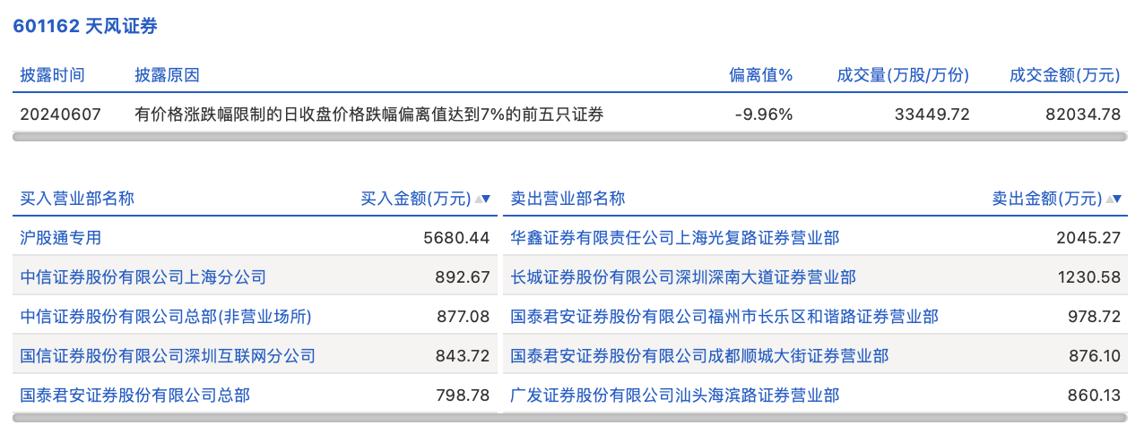 6月7日,天风证券今日跌停,龙虎榜数据显示,上榜营业部席位全天成交1.51亿元,占当日总成交金额比例为18.39%。其中,买入金额为9092.69万元,卖出金额为5990.8万元,合计净买入3101.9万元。