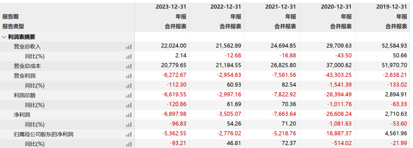 受此影响,朗源股份已经连续4年亏损且累计亏损额超3亿元。2020年至2023年,朗源股份营业总收入分别为2.97亿元、2.47亿元、2.16亿元、2.2亿元,归母净利润分别为-1.89亿元、-5218.7万元、-2776.02万元、-5362.55万元。