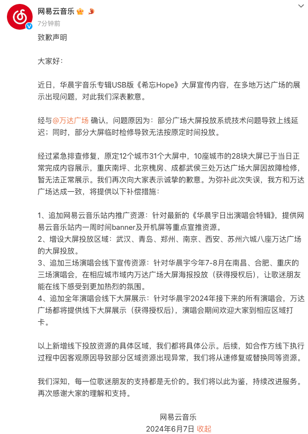 6月7日晚,针对华晨宇音乐专辑USB版《希忘Hope》大屏宣传内容在多地万达广场的展示出现问题一事,网易云音乐发布致歉声明称,经与万达广场确认,问题原因为:部分广场大屏投放系统技术问题导致上线延迟;同时,部分大屏临时检修导致无法按原定时间投放。经过紧急排查修复,原定12个城市31个大屏中,10座城市的28块大屏已于当日正常完成内容展示,重庆南坪、北京槐房、成都武侯三处万达广场大屏因故障检修,暂无法正常展示。