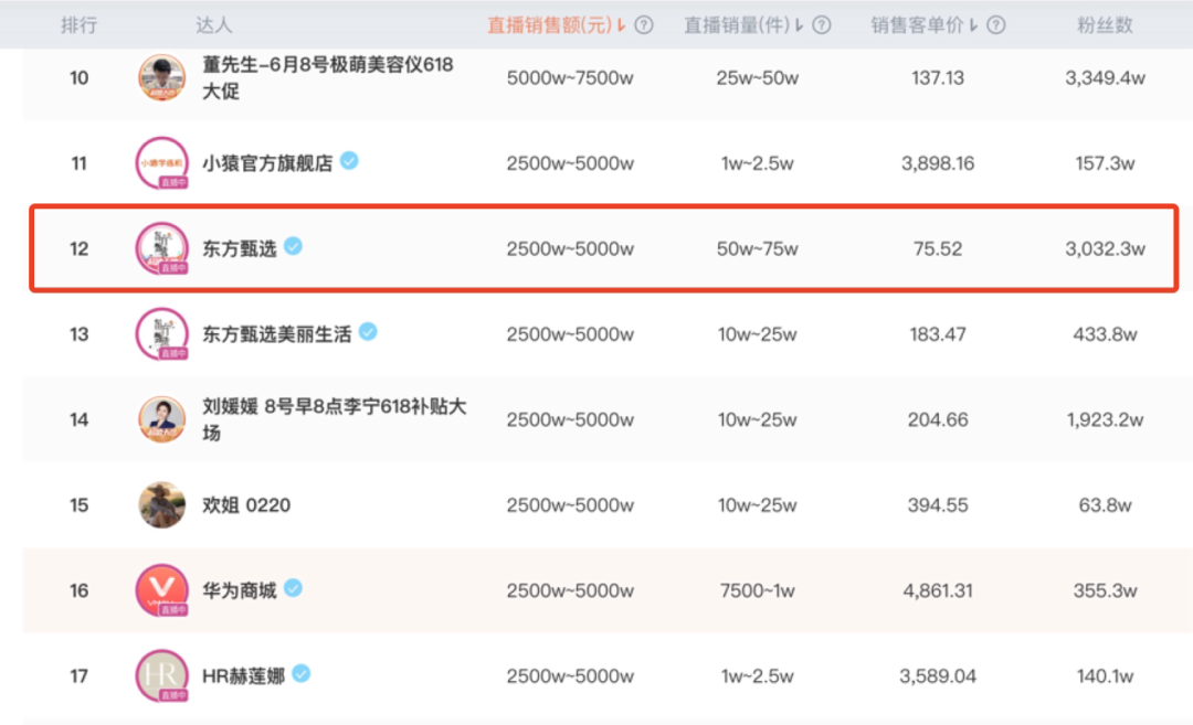 此外,根据蝉妈妈带货达人月度榜单显示,东方甄选在去年12月份还处于榜单第一的位置,但从今年1月份开始,从第4名一路跌到4月份的第9名。而在6月1日-6月6日的带货达人榜单上,东方甄选已经跌出前10,位列第12名。
