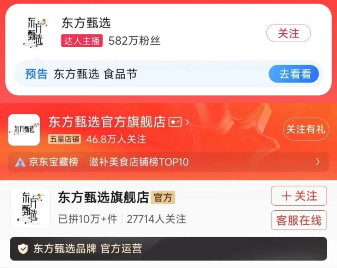 自此,东方甄选又开始尝试多平台发展,并且在去年8月官宣入驻淘宝直播,而后又在京东、拼多多开店卖货。不过,东方甄选的多平台发展策略并未取得明显的进展。除淘宝店铺拥有582万粉丝外,东方甄选京东店铺仅有46.8万人关注,拼多多东方甄选旗舰店更是只有2.7万人关注。