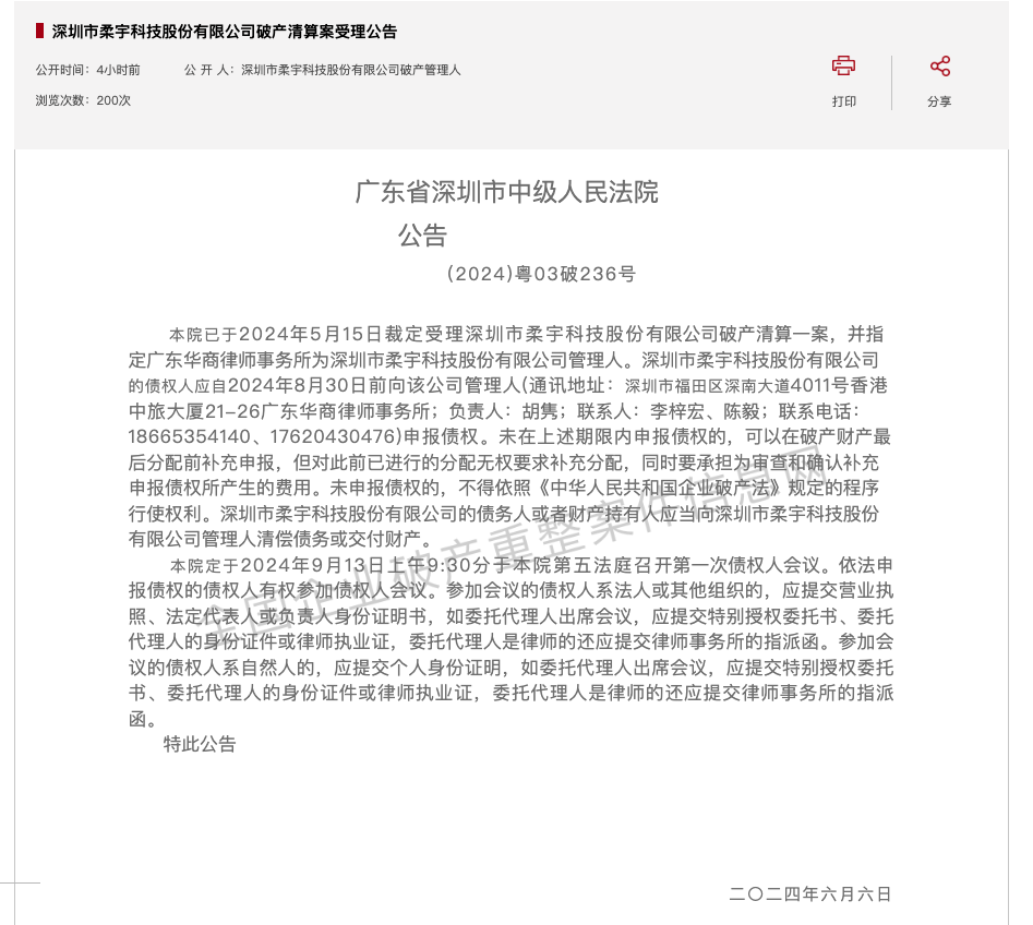 全国企业破产重整案件信息网显示,6月6日,深圳市中级人民法院发布公告称,已裁定受理深圳市柔宇科技股份有限公司(下称柔宇科技)破产清算案,并已指定管理人。柔宇科技的债权人应在2024年8月30日前向该公司管理人申报债权。未在上述期限内申报债权的,可以在破产财产最后分配前补充申报,但对此前已进行的分配无权要求补充分配,同时要承担为审查和确认补充申报债权所产生的费用。未申报债权的,不得依照破产法规定的程序行使权利。