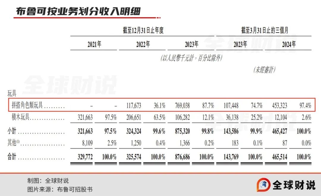 积木类玩具收入却逐渐萎缩,由2021年占总收入的97.5%减少至2024年一季度的2.6%。