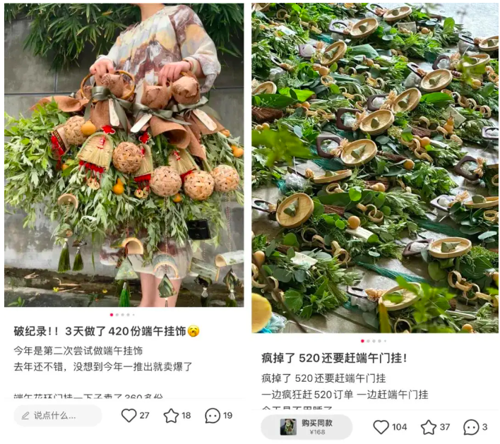 有店主表示,这一波热度主要源于社交电商上的博主“种草”,高颜值的新式门挂成了过节晒图的社交货币,店里艾草花束订单80%来自线上。