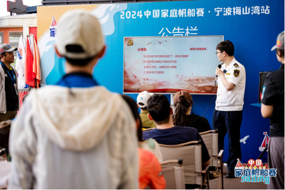 为确保本次家帆赛安全顺利举办,本次家庭帆船赛前特意举办了水上安全宣教,邀请宁波海事局梅山海事处执法人员就人员受伤、落水、船只碰撞等开展了安全宣讲小课堂,并由海事巡逻艇对赛事现场开展巡航警戒,让参赛家庭在安全完成比赛。此外,北仑气象站对本次赛事提供实时气象支持,为比赛的天气情况进行实时报道,为比赛保驾护航。