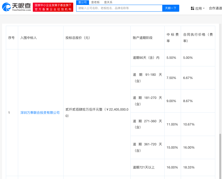以建设银行广西分行为例,据天眼查APP,2023年1月,该分行对外披露了信用卡不良资产委外催收项目的服务费率,采用阶梯式,中标的催收公司执行费率为:90天以内5%,91-180天6.67%,181-270天8.67%,271-360天的催收费率为10.76%,361天-720为16%,721天以上的催收费率为18.33%。