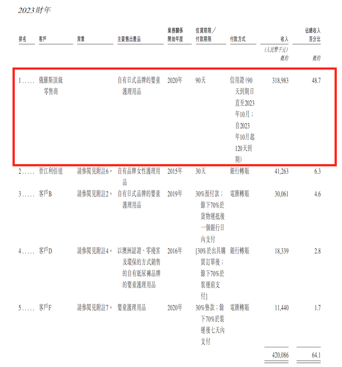 界面新闻记者注意到,公司每年前五大客户中,均有3家为俄罗斯客户。其中,舒宝国际的2021年第二大客户、2022年及2023年第一大客户为均俄罗斯顶级零售商,占公司总收入的比重分别为11.8%、31.5%、48.7%,舒宝国际逐渐患上大客户“依赖症”。