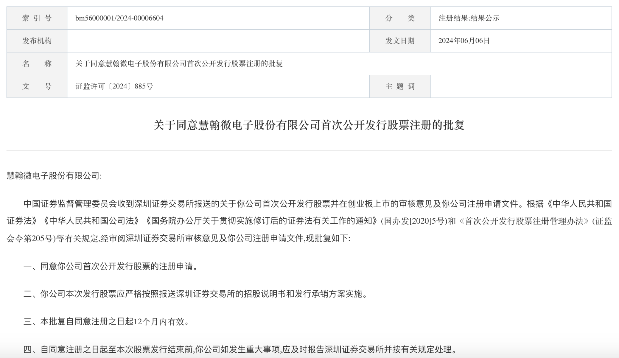 冲锋创业板的慧翰股份迎来好消息,6月6日,公司首次公开发行股票注册申请得到证监会的同意批复。