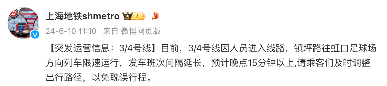 @上海地铁shmetro 微博消息,目前,3/4号线因人员进入线路,镇坪路往虹口足球场方向列车限速运行,发车班次间隔延长,预计晚点15分钟以上,请乘客们及时调整出行路径,以免耽误行程。