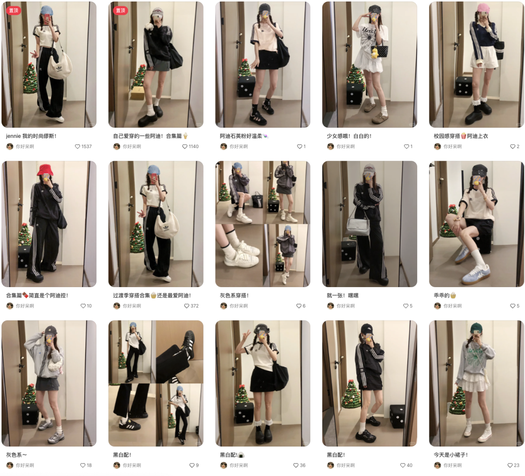 这些符合当下潮流的三叶草单品不仅多次出现在马思纯、郑秀晶、Jennie、易梦玲等明星身上,也因越来越贴合大众审美而被众多消费者选择。有的博主甚至专门开始卷阿迪穿搭,将三叶草的时尚演绎得淋漓尽致。
