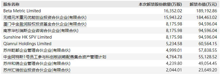 阿特斯此次解禁的股东共31位,16名战略配售股东和15名首发限售股东。包括股东Beta Metric Limited、无锡元禾重元优能创业投资合伙企业(有限合伙)、比亚迪股份有限公司等多家法人股东及机构股东。