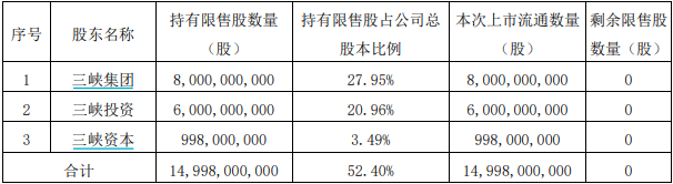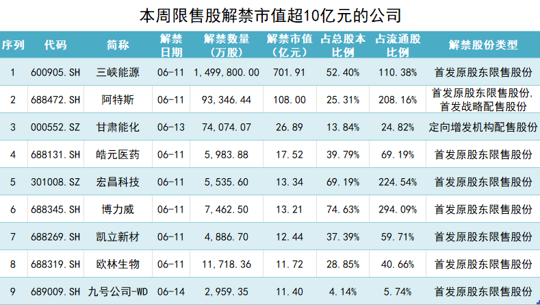 根据公告,上市三年的三峡能源6月11日将有150亿股首发限售股解禁,占总股本比例52.40%,约合市值701.91亿元。