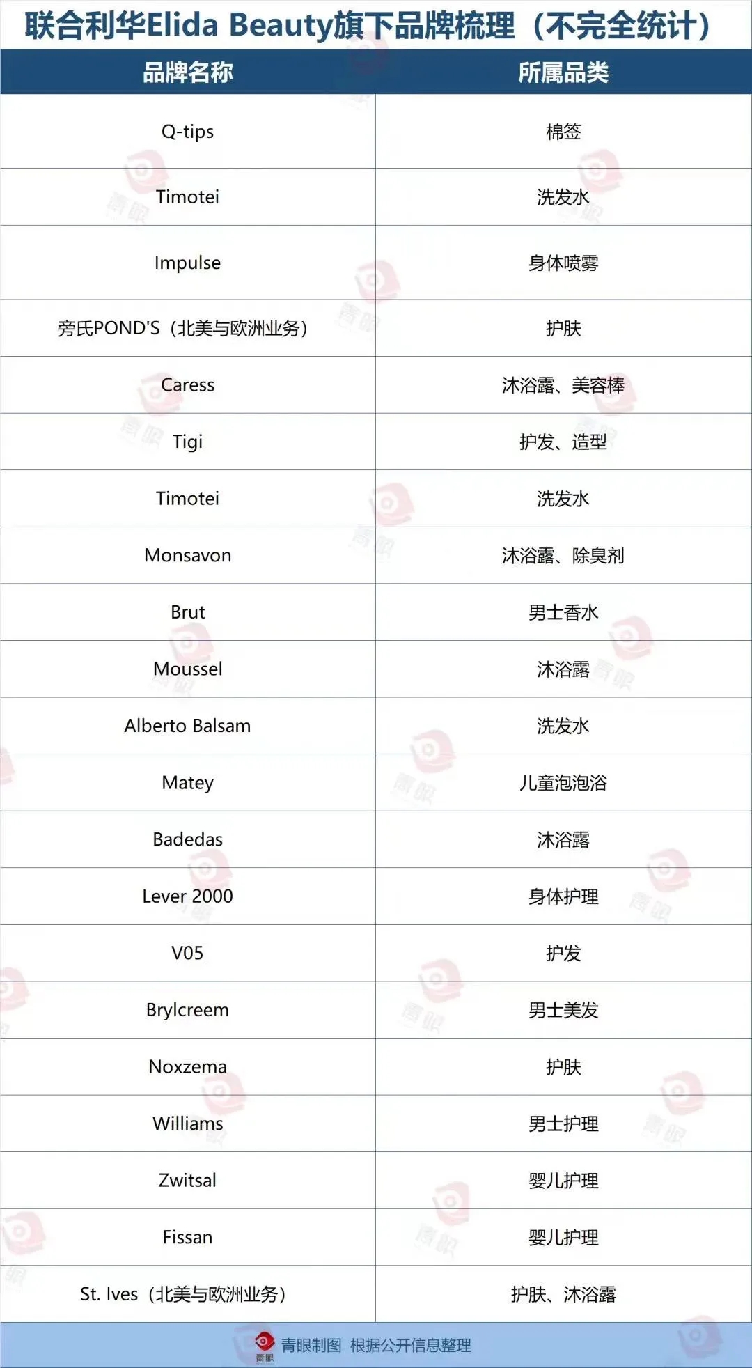 据公开资料,Elida Beauty创立于2021年,隶属于联合利华个人护理板块,旗下拥有20多个非核心美容和个人护理品牌,包括Q-tips®、Caress、Ponds旁氏和St. Ives(仅限北美和欧洲)、Impulse、Noxzema、Monsavon、Timotei等。该业务在2022年创造了约7.6亿美元(约合人民币55.07亿元)的收入。