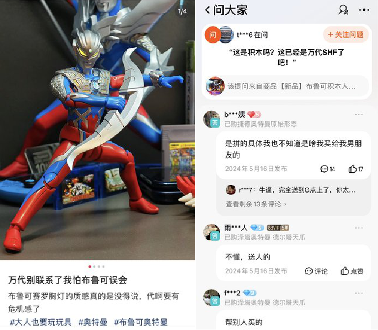 在小红书和天猫上,还出现了不少布鲁可与万代的奥特曼对比帖,某消费者表示:“如果早出几年,我还买啥万代?希望布鲁可把剩下的奥特曼都做一遍。”