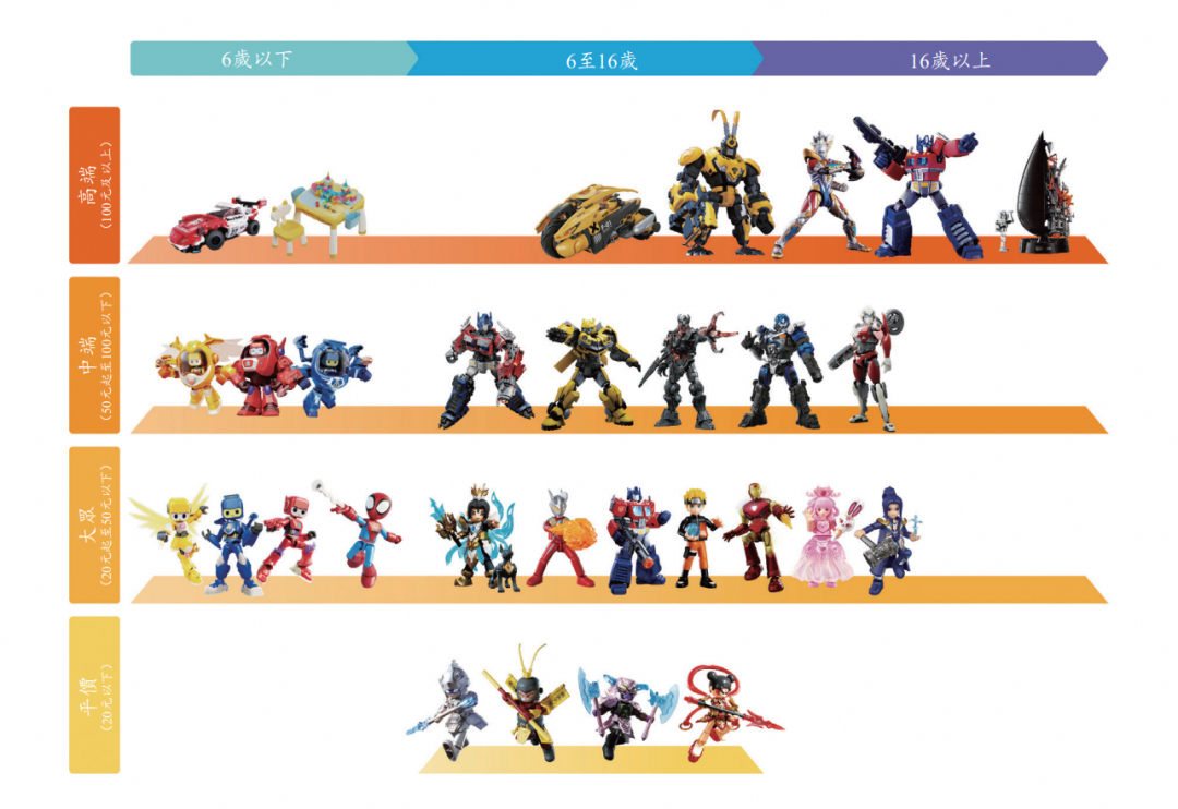 拿到奥特曼IP,意味着布鲁可突破了低龄儿童玩具的范畴,走向了全年龄段玩具这个更广阔的市场。招股书显示,至2024年3月,布鲁可共有391款SKU,243款面向6岁至16岁,18款面向16岁以上,且将中高端产品安排在了较高的年龄段。