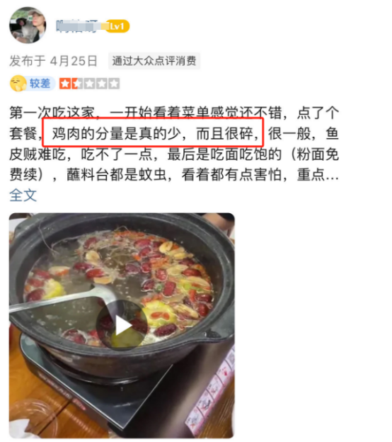 与小丽有类似经历的消费者不少,红餐网注意到,在大众点评等平台上,关于鸡煲“肉碎”“太柴”“口感不佳”的评论并不少。