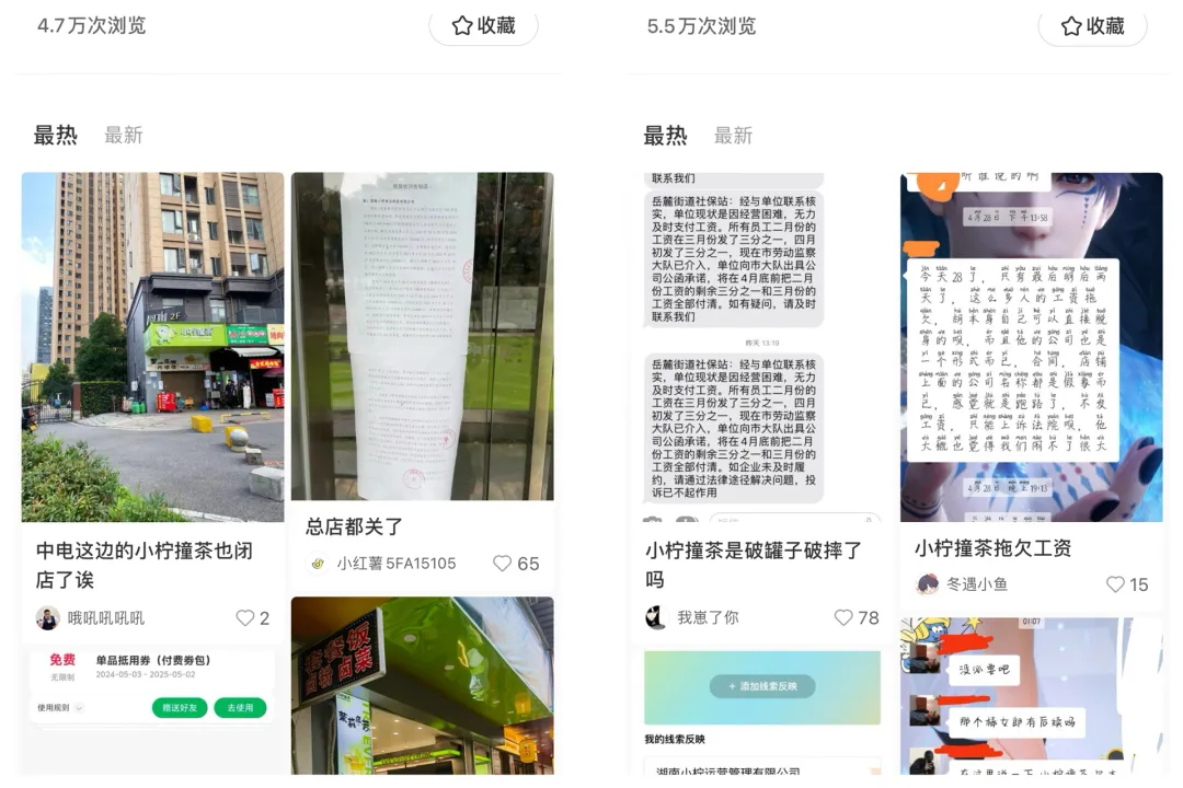 截至2024年6月9日,小红书“小柠撞茶倒闭了”话题浏览次数达到4.7万次;而“小柠撞茶拖欠工资”的讨论则更引人关注,其浏览次数高达5.5万次。
