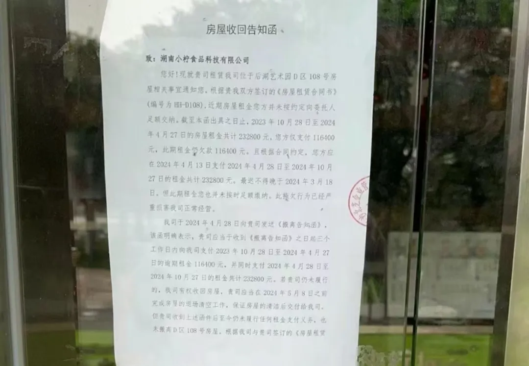 张贴在门店大门的一张房屋收回告知函显示,湖南小柠食品科技有限公司应在2024年4月28日收到《搬离告知函》起,3个工作日内支付2023年10月28日至2024年4月27日的116400元租金,以及支付2024年4月28日至2024年10月27日的租金共计232800元。但截至2024年5月21日,房东在贴出《房屋收回告知函》时,湖南小柠食品科技有限公司仍未支付该门店所欠租金。