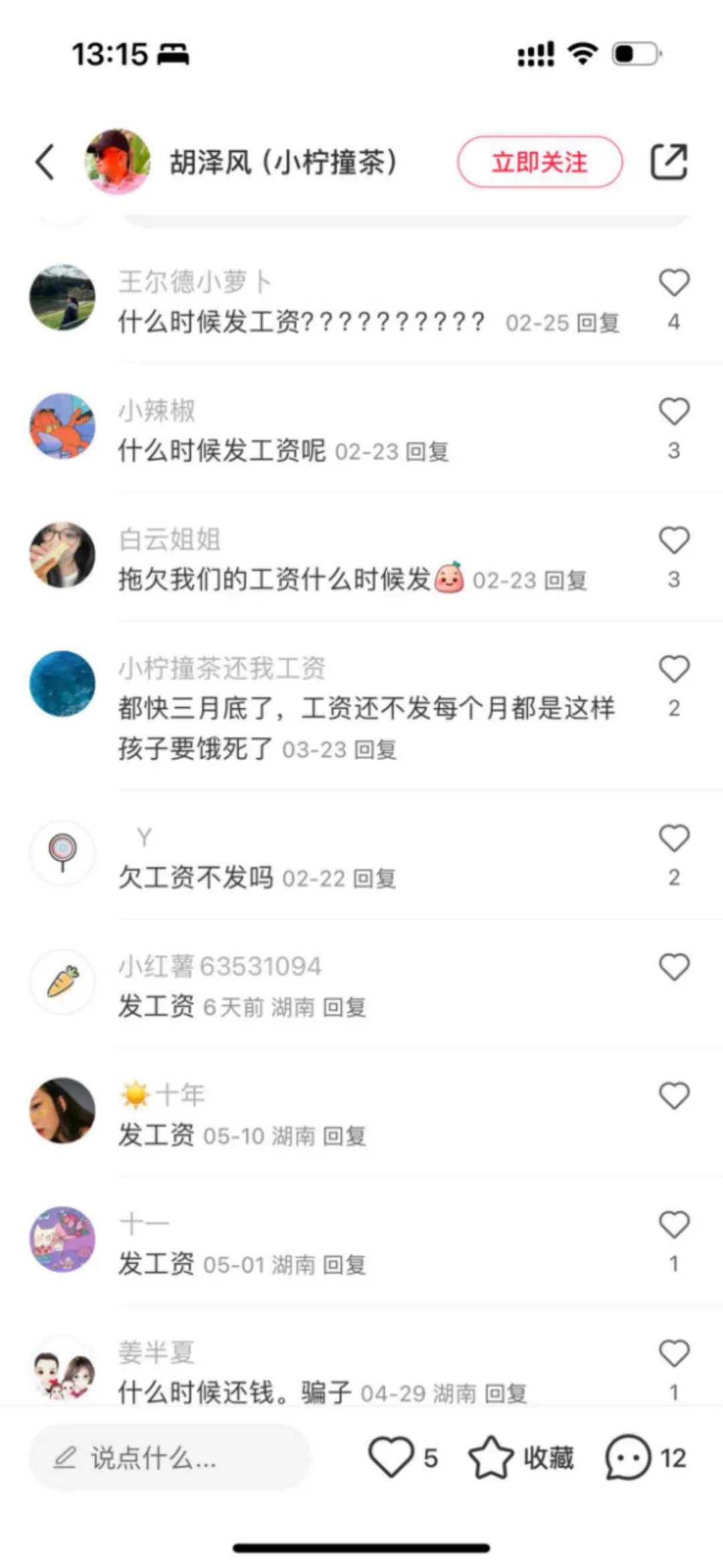 也有人直接在小柠撞茶法人代表胡泽风的小红书账号下催发工资,但截至红餐网发稿,该账号始终没有任何回应。