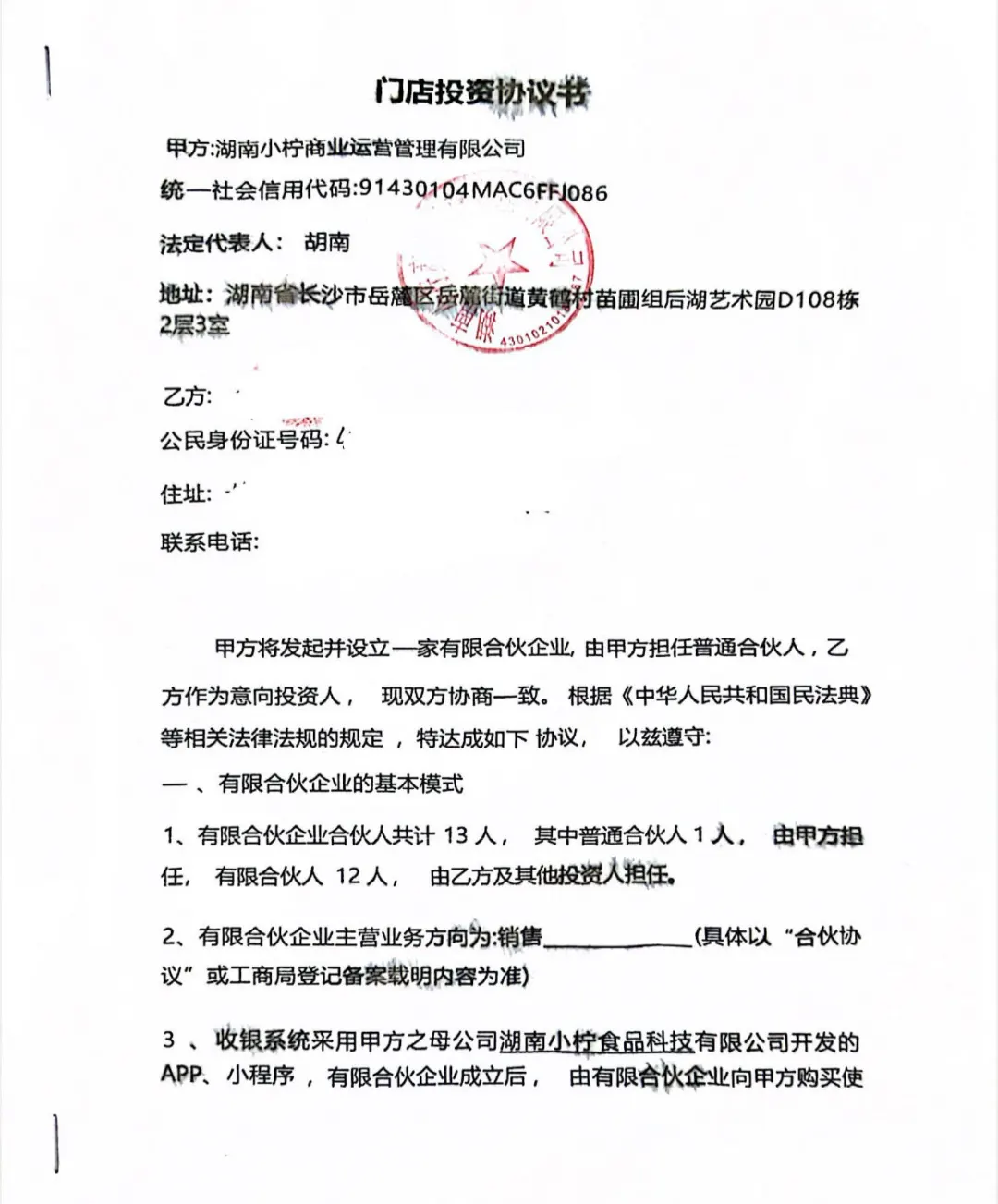 协议还规定,当有限合伙人人数满足12人条件时,甲方再开始经营门店的选址、门店租赁、设备采购和人员招聘等工作,期间涉及的相关费用,甲方会从代收投资款中先行支付,待有限合伙企业成立后,由有限合伙企业统一支付给甲方,其中收银系统必须采用由甲方母公司湖南小柠食品科技有限公司开发的APP、小程序。