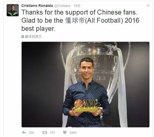 ▼C罗在自己的社交媒体上与大家分享了获得懂球帝MVP的喜悦