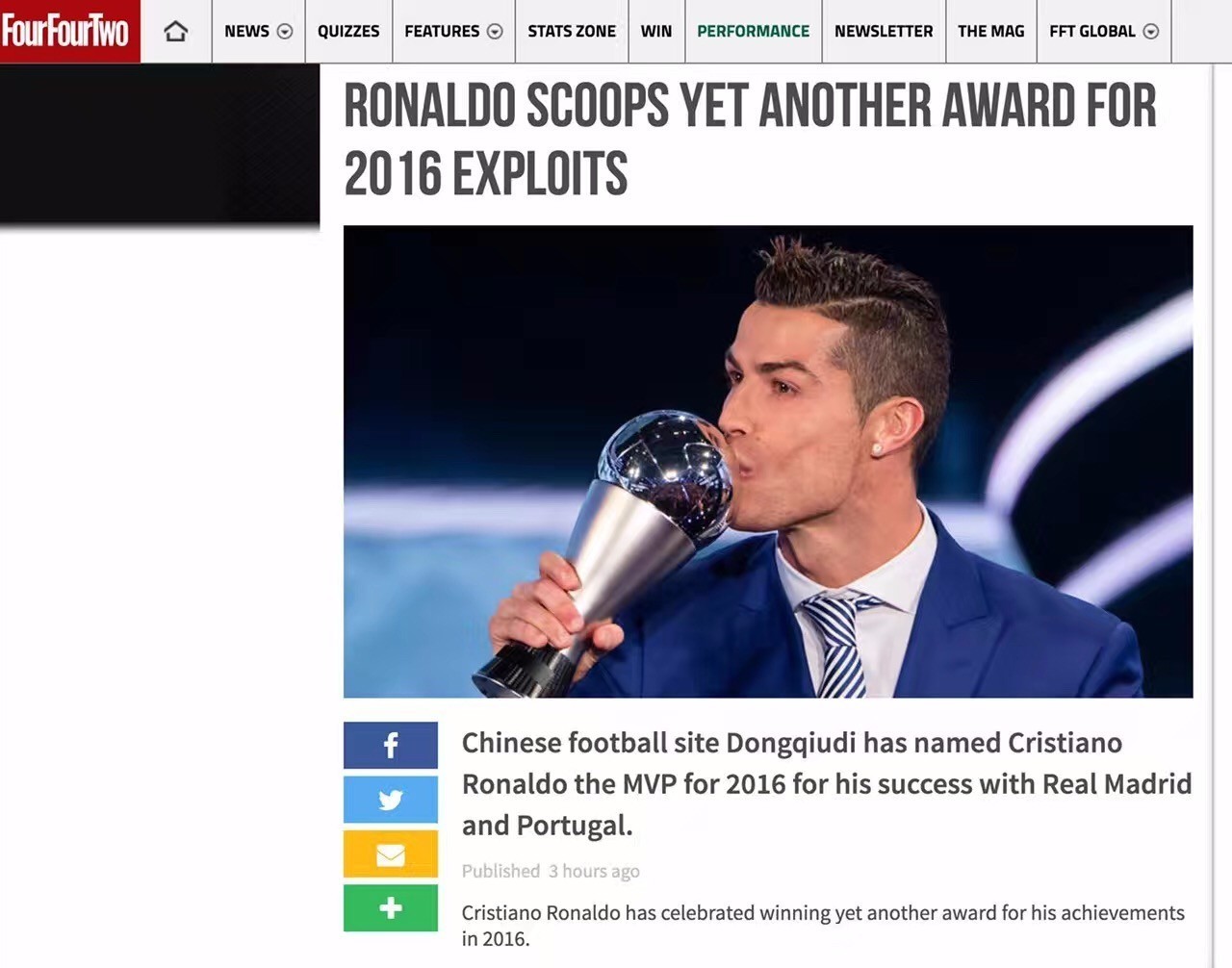 ▼《442》、《阿斯报》、《马卡报》等欧洲著名媒体均报道了C罗获得懂球帝颁奖的新闻