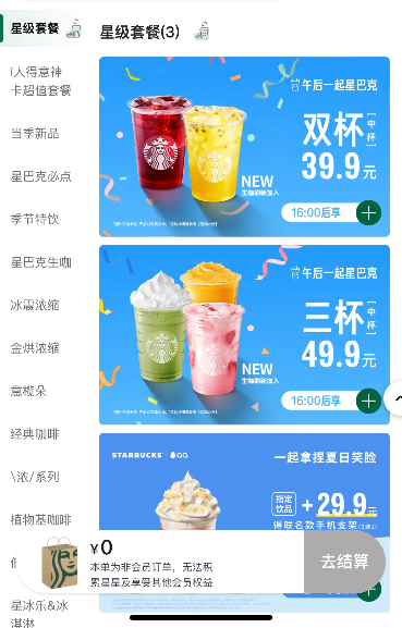 从单价三四十元一杯到9.9元一杯,对于星巴克来说,一下子放低身段至此还是有点难,也因此,需要叠加饿了么等平台的各种羊毛优惠才能做到如此低价,但如今,普通用户的星巴克小程序内,确实会被不间断投喂大量39.9元两杯、49.9元三杯的任选优惠券。
