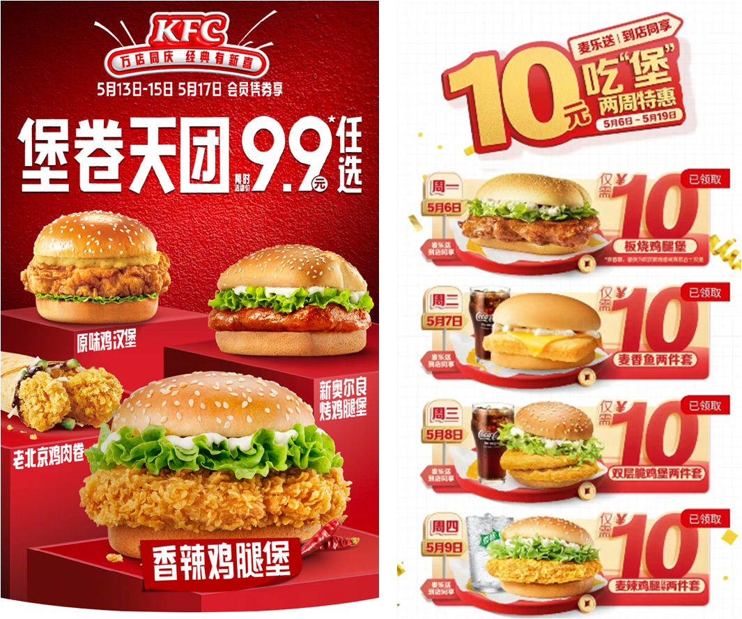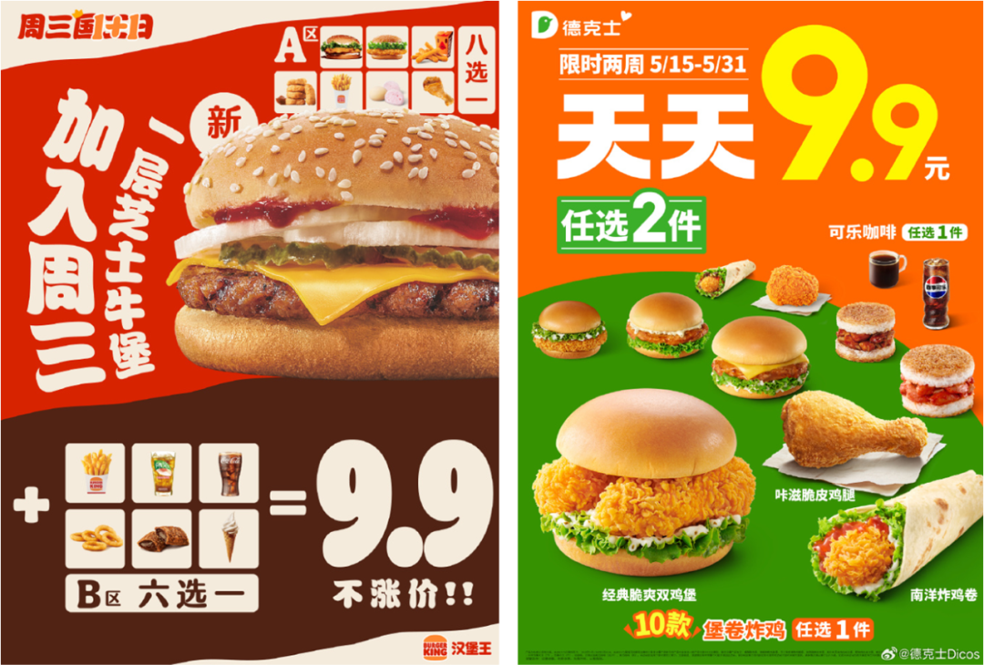 而现在,从9.9元特价堡券,到十元两件任选的活动,都刷新了上述二者传统“穷鬼套餐”的价格底线。这也是它们入局如今这场风靡的价格战的具象表现。