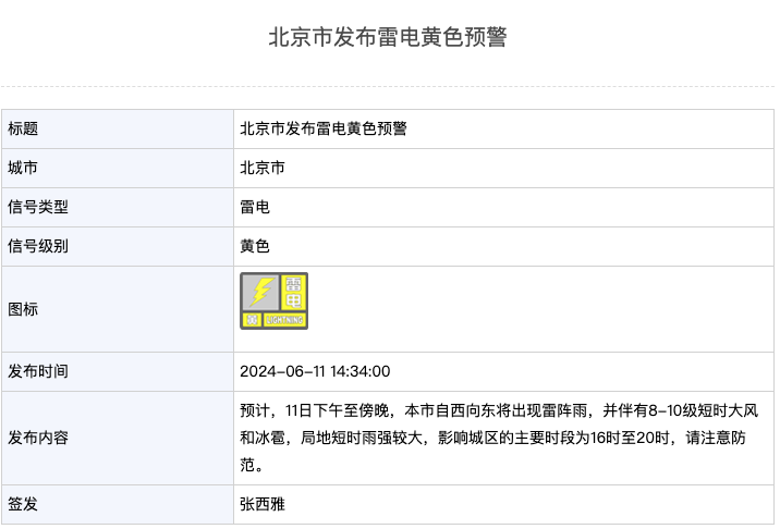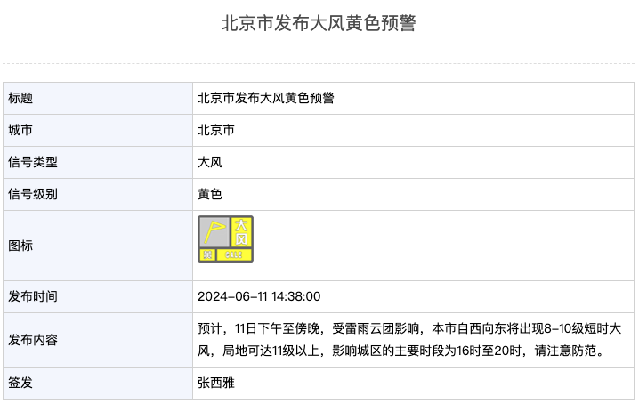 北京市14时38分发布大风黄色预警:预计,11日下午至傍晚,受雷雨云团影响,本市自西向东将出现8-10级短时大风,局地可达11级以上,影响城区的主要时段为16时至20时。