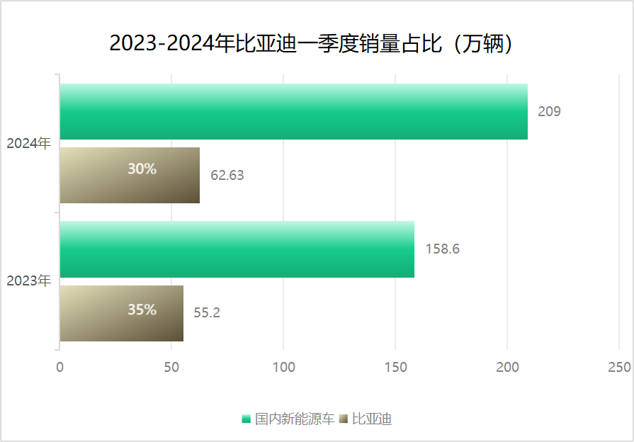 比亚迪可以无限强大,但汽车市场有它自己的规律。庞大的份额与极长的战线下,守江山终究是一种巨大的挑战——今年一季度,比亚迪总销量62.63万辆,占国内新能源汽车的总销量209万辆份额为30%,而前一年,这个数字是35%。在插混市场,比亚迪的市场份额也从65%降到了54%。
