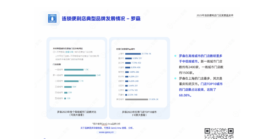 罗森的消费群体中,有不少像Vivian这样的一线城市打工人。根据公众号GeoQ智图发布的《2023年连锁便利店加速“洗牌”,数据盘点行业发展现状》,罗森在高线城市的门店覆盖率明显高于下线城市,且门店TOP10城市的门店数占比较高,达到了68.08%。