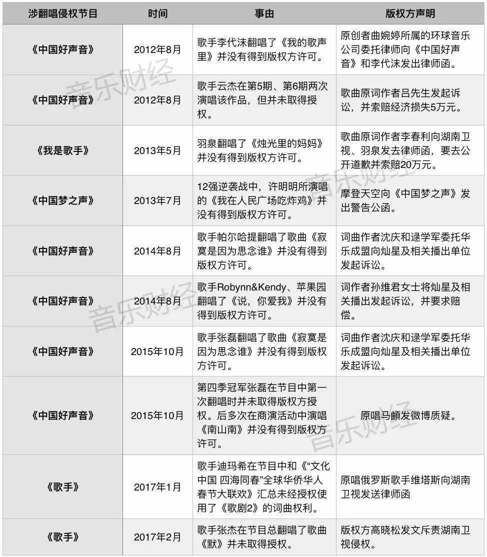 音乐财经总结了近年来的部分电视节目音乐侵权事件:
