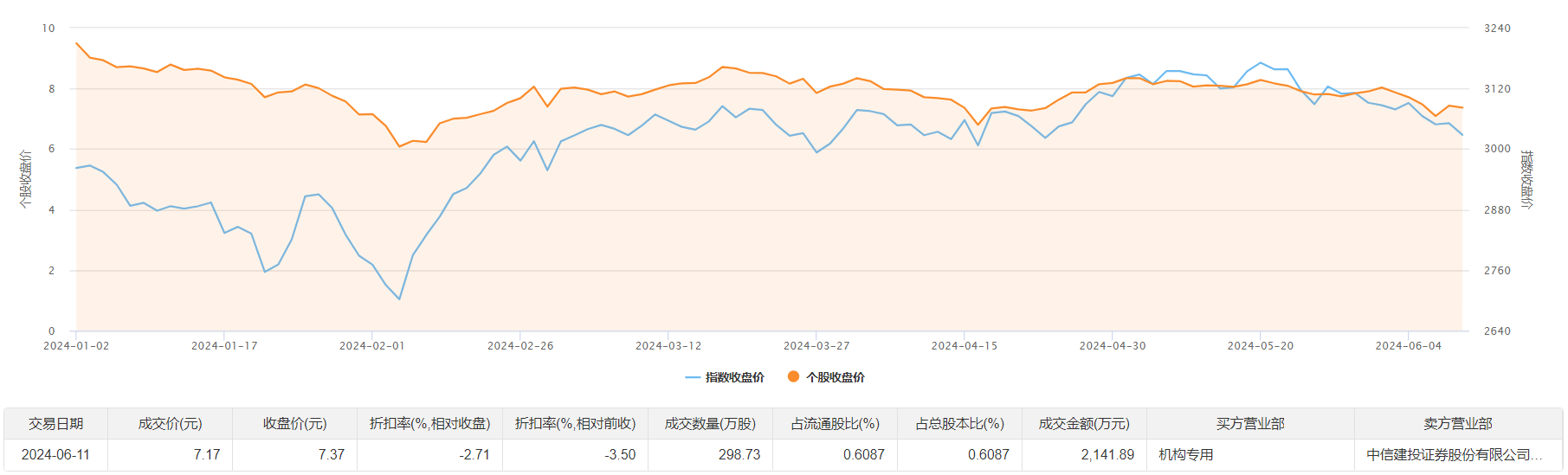 腾龙股份6月11日大宗交易成交298.73万股,成交额2141.89万元,占当日总成交额的31.35%,成交价7.17元,较市场收盘价7.37元折价2.71%。