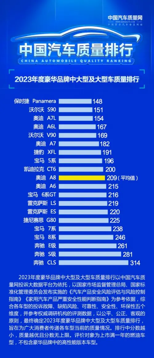 中国汽车质量网《2023年度豪华品牌中大型及大型车质量排行》显示,奥迪、宝马、奔驰多款车型质量低于平均值以下,就连素来以质量著称的雷克萨斯和捷尼赛思也频发质量问题。