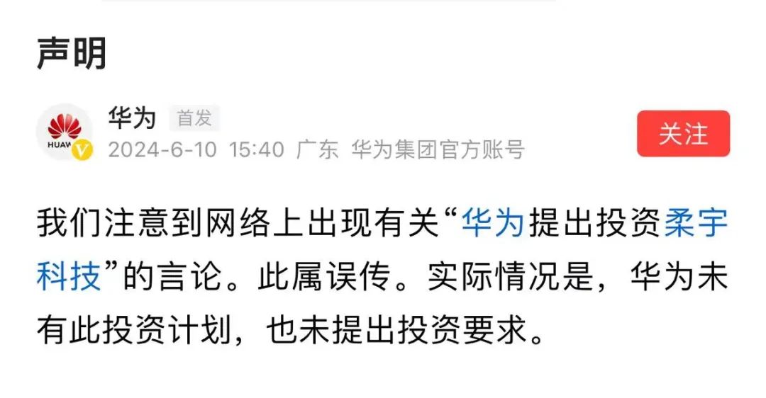 但是对于“华为有意投资柔宇,却被拒绝”的言论,6月10日端午节这天,华为在其集团官方账号发布声明澄清。表示有关“华为提出投资柔宇科技”的言论属于误传。实际情况是,华为未有此投资计划,也未提出投资要求。