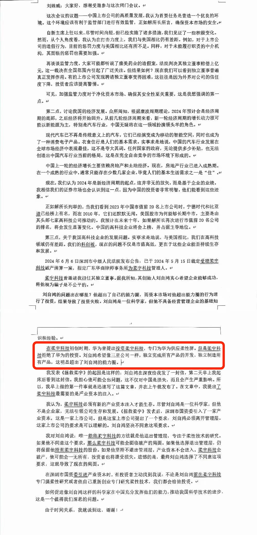 刘姝威还在不久前的发言中提到,尽管刘自鸿是一位科学家,但他不是企业家,无法引领公司生存和发展。《拯救柔宇》发表后,深圳市国资委引入了一家产业资本,这是一家上市公司。但是这家上市公司提出了一个要求:刘自鸿必须离开管理层。这家上市公司的要求是可以理解的。刘自鸿坚决不同意这项要求。