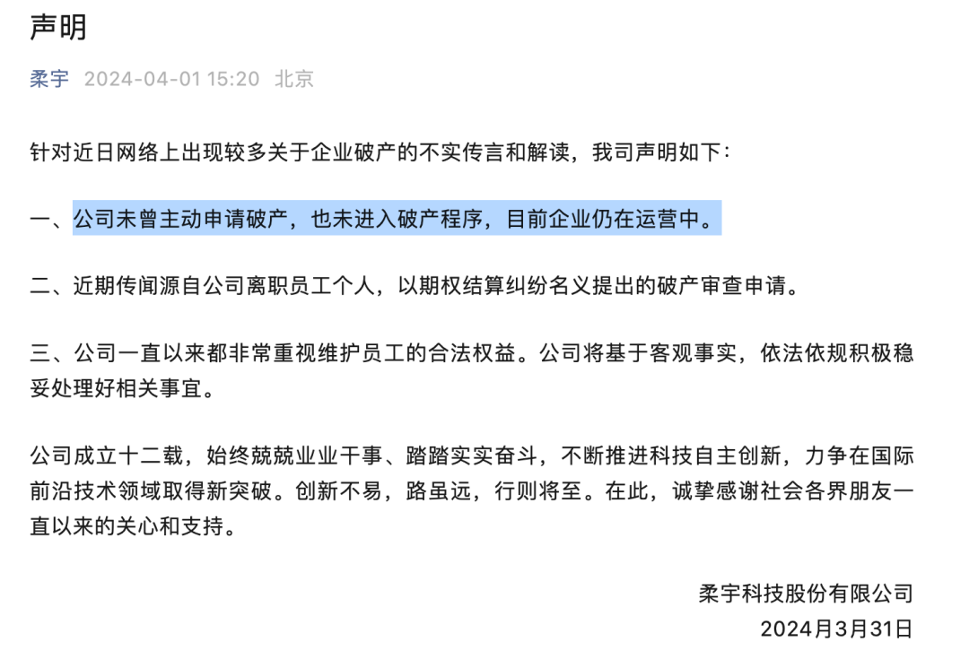 4月1日,官微久未更新的柔宇科技发布了今年的第一条推送,对公司的“破产传言”进行声明,表示公司未曾主动申请破产,也未进入破产程序,目前企业仍在运营中。